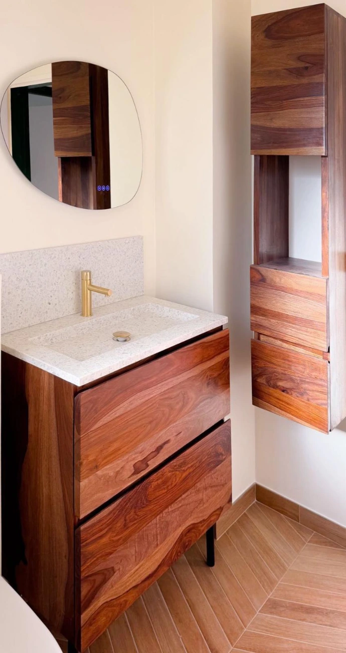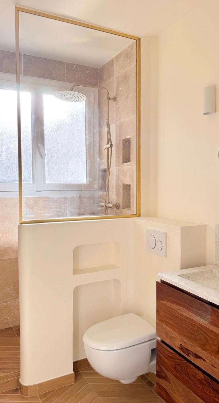 Le résultat est une salle de bain harmonieuse, apaisante et fonctionnelle, où chaque élément trouve sa place. Le contraste avant/après est flagrant : on passe d’un espace moderne mais froid à une pièce chaleureuse, lumineuse et accueillante.